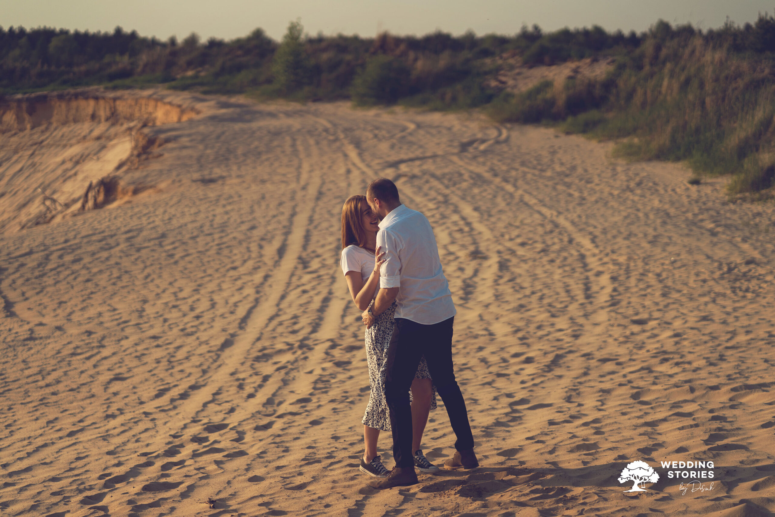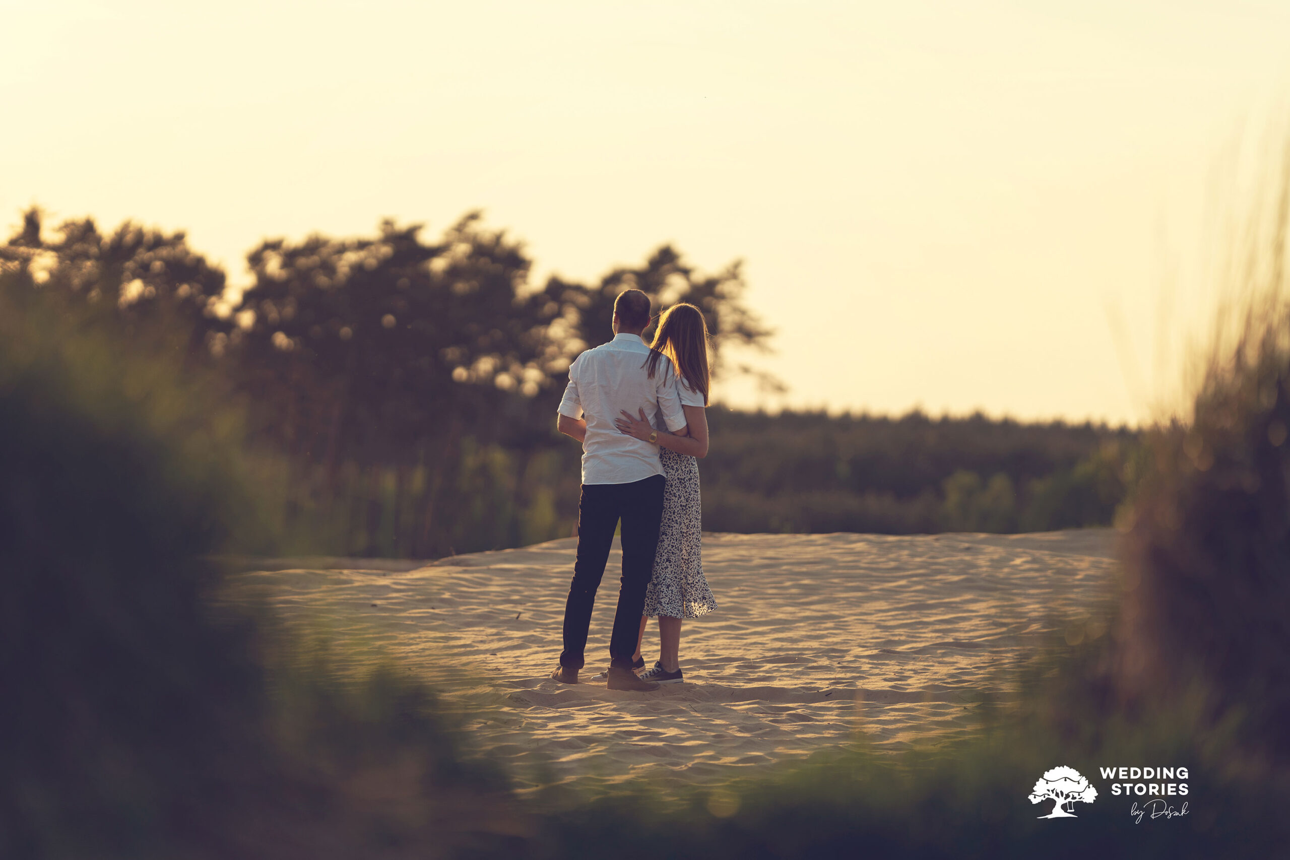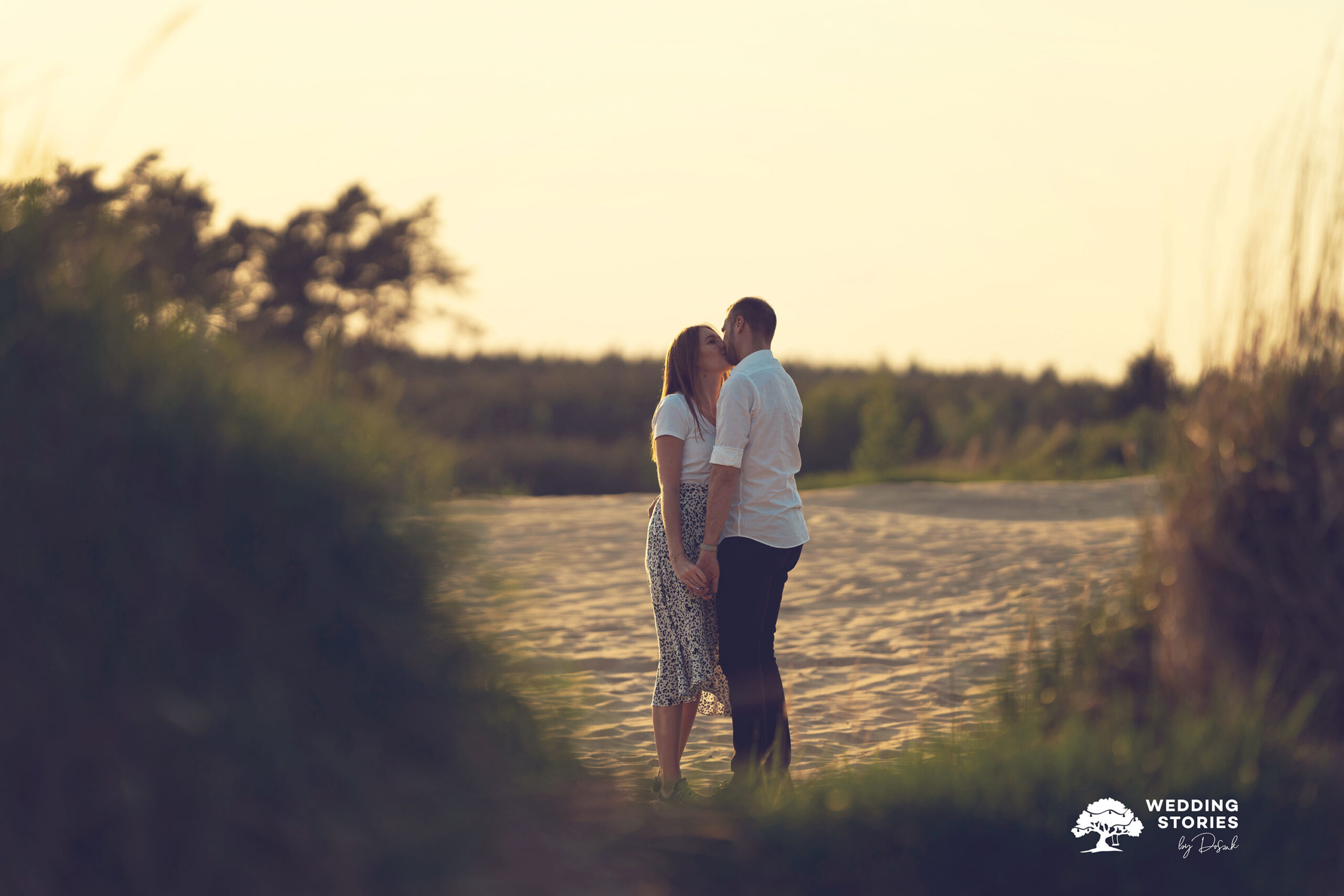 Podczas tej sesji postawiłem na prostotę i naturalne światło. Fotografowanie na wydmach daje ogromne możliwości — szczególnie o zachodzie słońca. Światło staje się wtedy miękkie, ciepłe i bardzo plastyczne. Dzięki temu każda scena nabiera lekkości i spokoju. Nie potrzeba skomplikowanych ustawień ani sztucznego pozowania. Wystarczy być tu i teraz. To właśnie w takich momentach powstają najbardziej autentyczne kadry. Dlaczego warto wybrać wydmy w Kosowcach na sesję narzeczeńską?